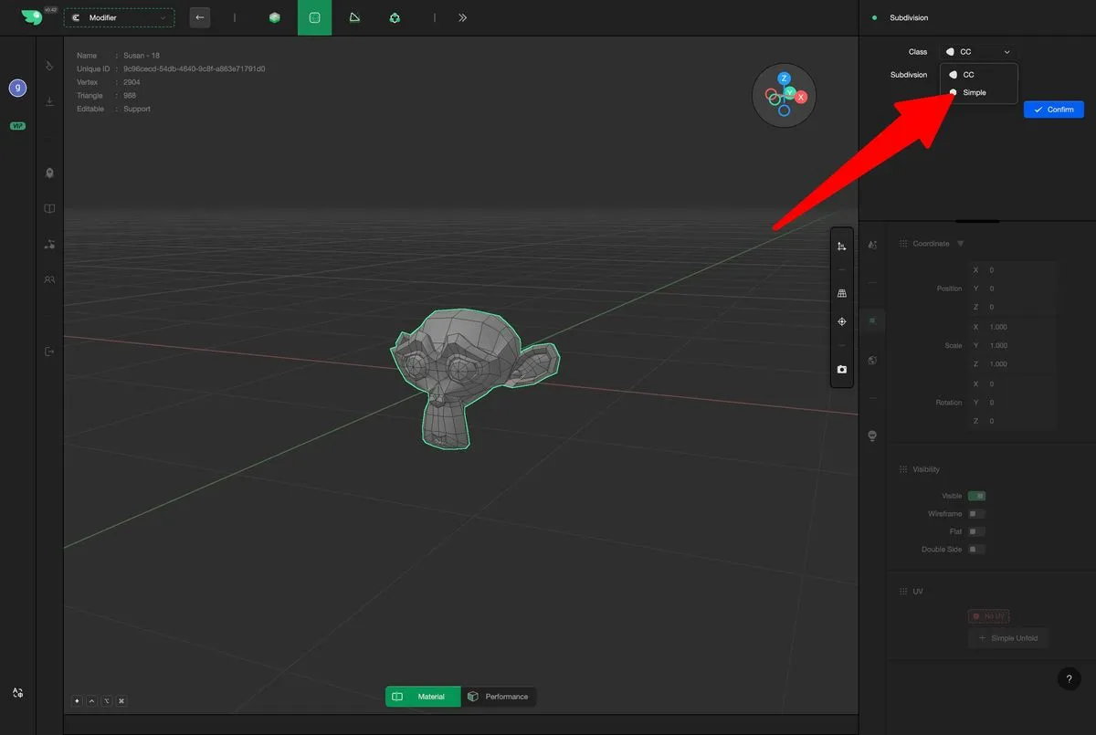 Make3D supports two subdivision methods: Simple Subdivision and Smooth Subdivision (known as Turbo Smooth in C4D). Both methods increase geometric density by inserting new vertices within existing faces and connecting them to surrounding edges. Subsequently, the positions of the new vertices are adjusted according to different algorithms:
